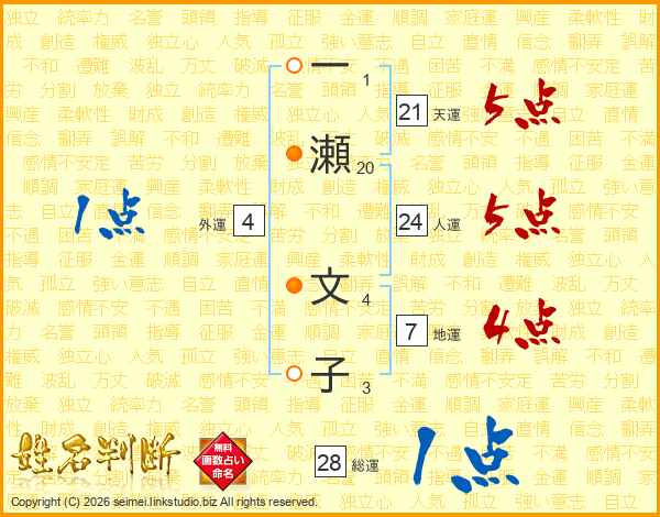 生活面を象徴する運勢です。外部から受ける影響力を表し、結婚運、家庭運や職場、環境への順応性を表します。総運から人運を引いた画数。姓や名が1文字の場合を除く。