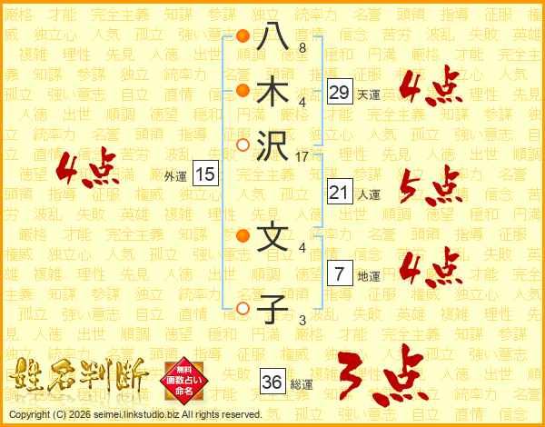 八(8画)木(4画)沢(17画) 文(4画)子(3画)