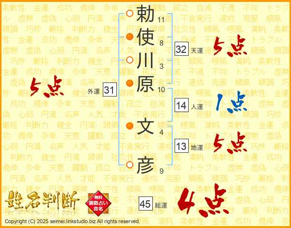 勅(11画)使(8画)川(3画)原(10画) 文(4画)彦(9画)