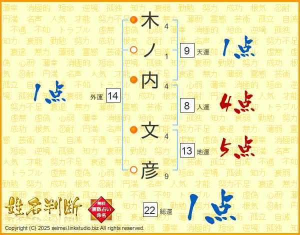 木(4画)ノ(1画)内(4画) 文(4画)彦(9画)