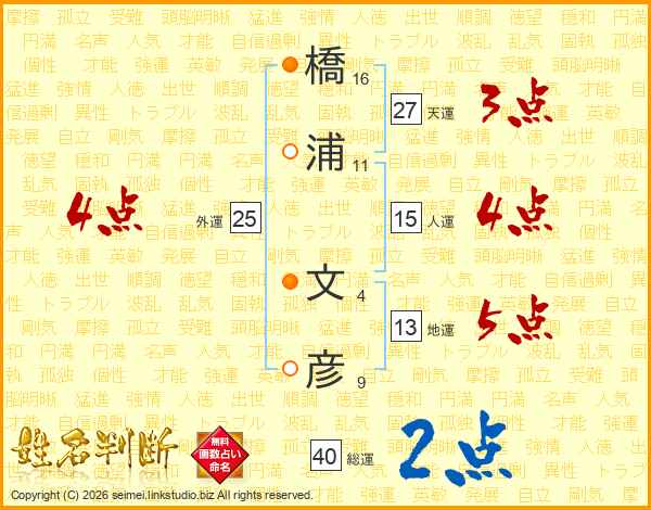 橋(16画)浦(11画) 文(4画)彦(9画)