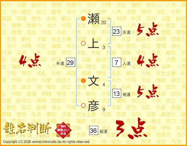 瀬(20画)上(3画) 文(4画)彦(9画)