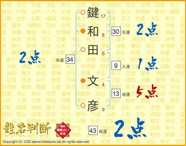 鍵和田文彦さんの天運は30画の2点!