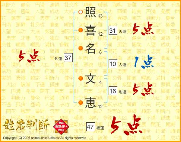 照(13画)喜(12画)名(6画) 文(4画)恵(12画)