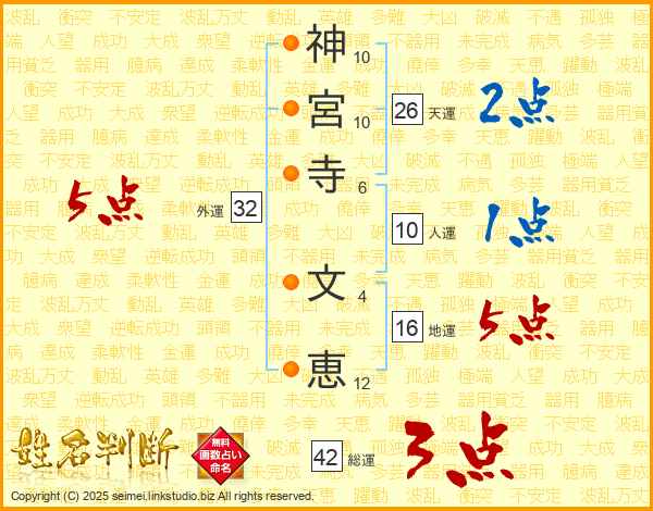 神(10画)宮(10画)寺(6画) 文(4画)恵(12画)