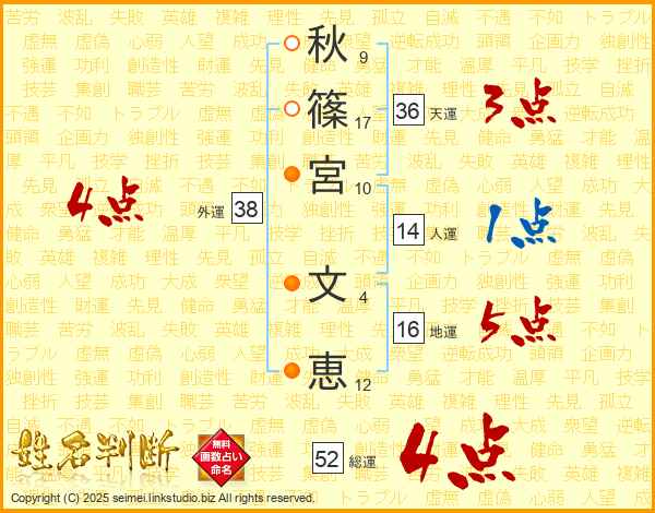 秋(9画)篠(17画)宮(10画) 文(4画)恵(12画)