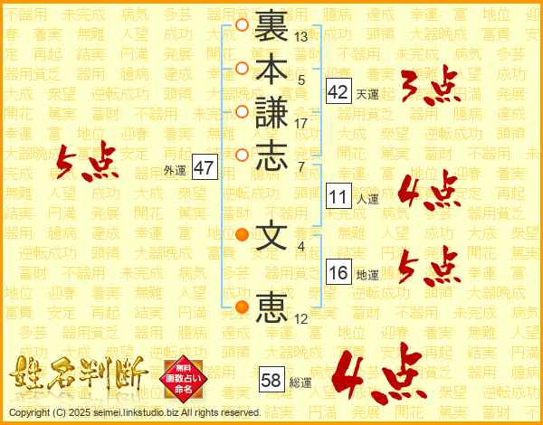 裏(13画)本(5画)謙(17画)志(7画) 文(4画)恵(12画)