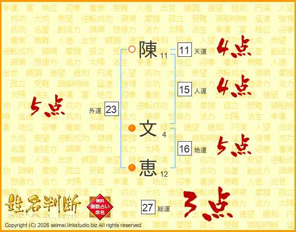 陳(11画) 文(4画)恵(12画)