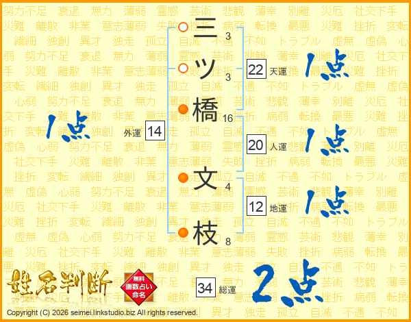 三ツ橋文枝さんの総運は34画の2点!