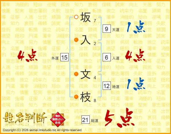 生活面を象徴する運勢です。外部から受ける影響力を表し、結婚運、家庭運や職場、環境への順応性を表します。総運から人運を引いた画数。姓や名が1文字の場合を除く。