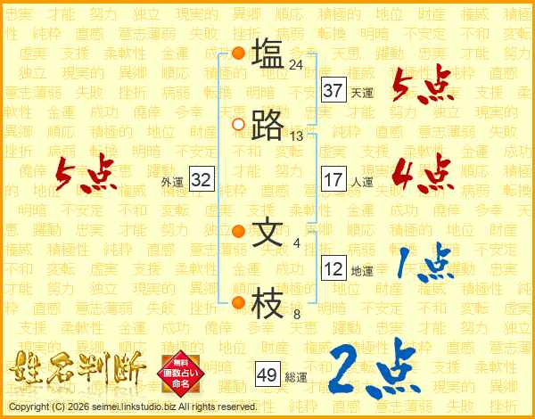 生活面を象徴する運勢です。外部から受ける影響力を表し、結婚運、家庭運や職場、環境への順応性を表します。総運から人運を引いた画数。姓や名が1文字の場合を除く。