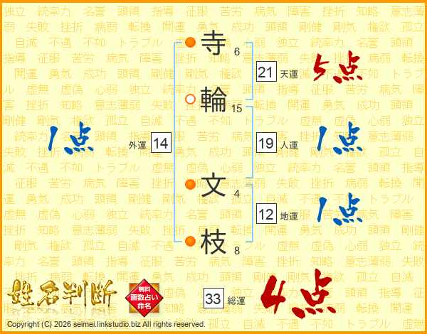 寺(6画)輪(15画) 文(4画)枝(8画)