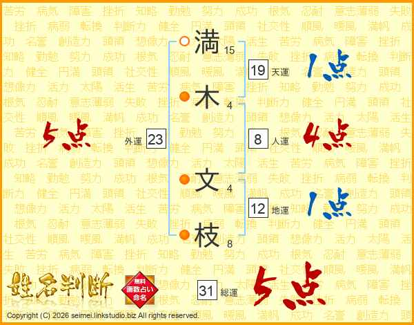 生活面を象徴する運勢です。外部から受ける影響力を表し、結婚運、家庭運や職場、環境への順応性を表します。総運から人運を引いた画数。姓や名が1文字の場合を除く。