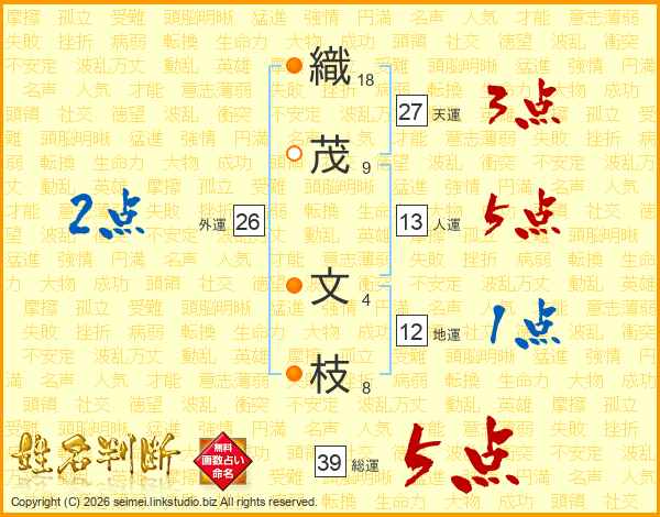 あなたの人生を表す1番重要な運勢です。生涯を通じて影響する総合運となり、主に50歳以降の晩年期に影響を及ぼします。苗字と名前の合計画数。