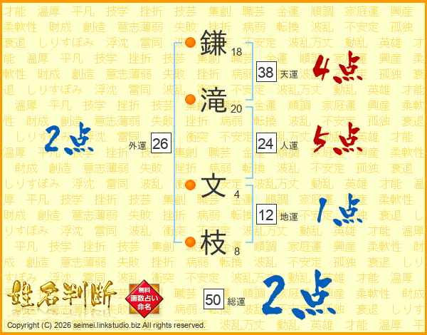 鎌(18画)滝(20画) 文(4画)枝(8画)
