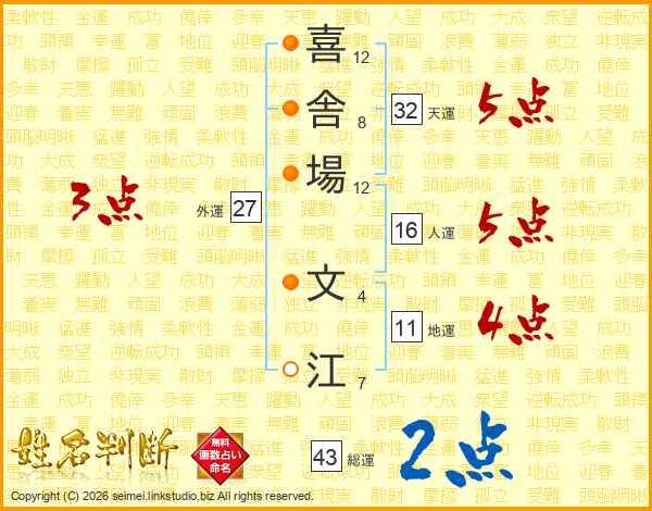 喜(12画)舎(8画)場(12画) 文(4画)江(7画)