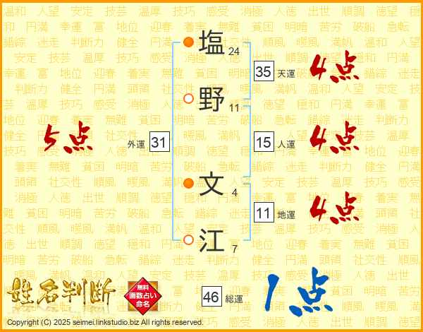 生活面を象徴する運勢です。外部から受ける影響力を表し、結婚運、家庭運や職場、環境への順応性を表します。総運から人運を引いた画数。姓や名が1文字の場合を除く。