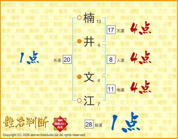 楠(13画)井(4画) 文(4画)江(7画)
