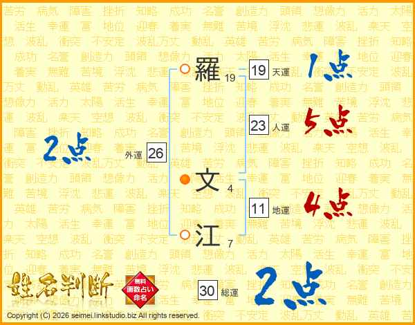 あなたの人生を表す1番重要な運勢です。生涯を通じて影響する総合運となり、主に50歳以降の晩年期に影響を及ぼします。苗字と名前の合計画数。