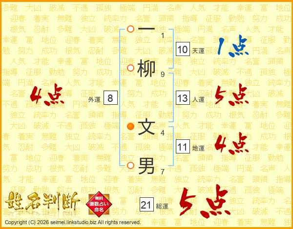 生活面を象徴する運勢です。外部から受ける影響力を表し、結婚運、家庭運や職場、環境への順応性を表します。総運から人運を引いた画数。姓や名が1文字の場合を除く。