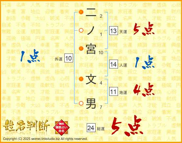二(2画)ノ(1画)宮(10画) 文(4画)男(7画)
