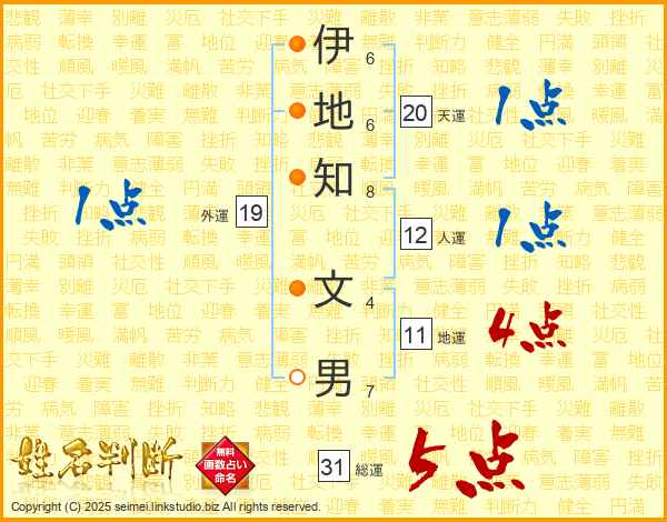 伊(6画)地(6画)知(8画) 文(4画)男(7画)