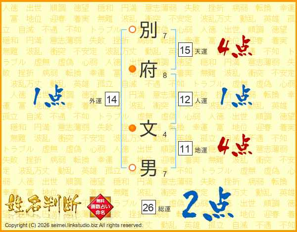 生活面を象徴する運勢です。外部から受ける影響力を表し、結婚運、家庭運や職場、環境への順応性を表します。総運から人運を引いた画数。姓や名が1文字の場合を除く。