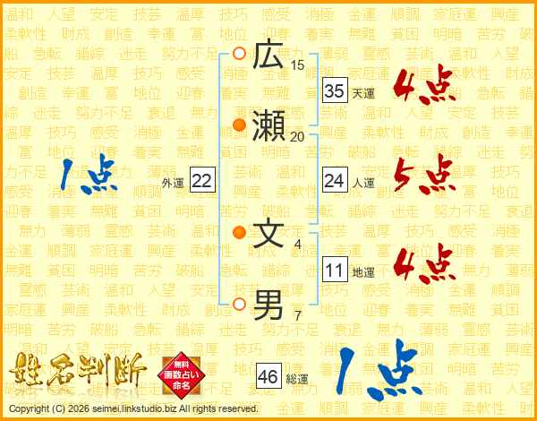 広(15画)瀬(20画) 文(4画)男(7画)