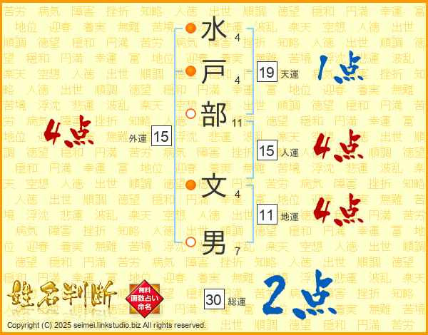 水(4画)戸(4画)部(11画) 文(4画)男(7画)