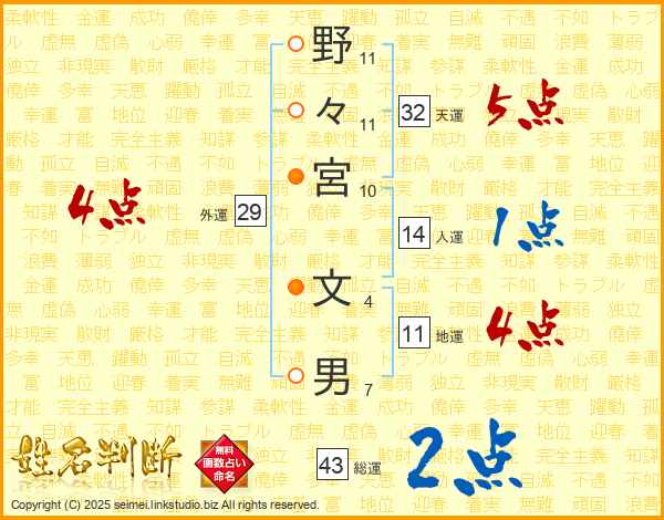 生活面を象徴する運勢です。外部から受ける影響力を表し、結婚運、家庭運や職場、環境への順応性を表します。総運から人運を引いた画数。姓や名が1文字の場合を除く。