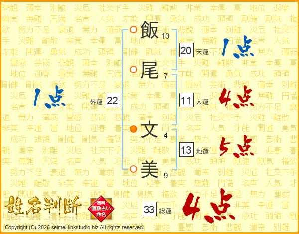 飯(13画)尾(7画) 文(4画)美(9画)