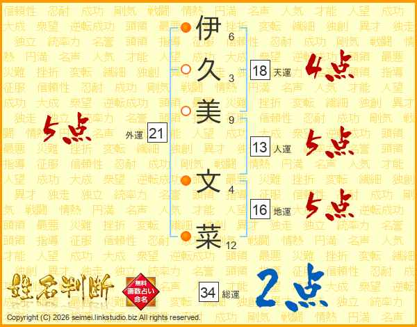 伊久美文菜さんの総運は34画の2点!