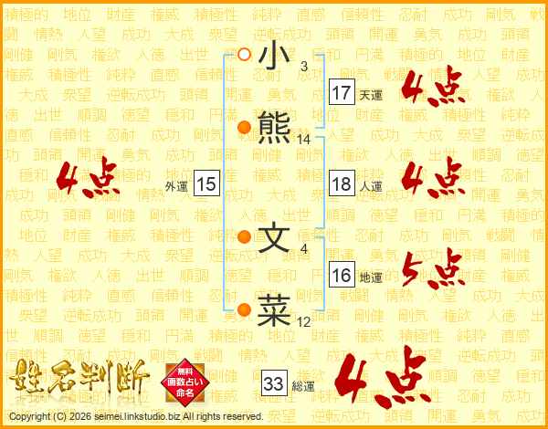 生活面を象徴する運勢です。外部から受ける影響力を表し、結婚運、家庭運や職場、環境への順応性を表します。総運から人運を引いた画数。姓や名が1文字の場合を除く。