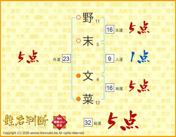 野末文菜さんの総運は32画の5点!
