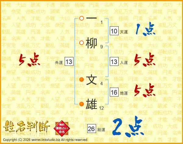 あなたの人生を表す1番重要な運勢です。生涯を通じて影響する総合運となり、主に50歳以降の晩年期に影響を及ぼします。苗字と名前の合計画数。
