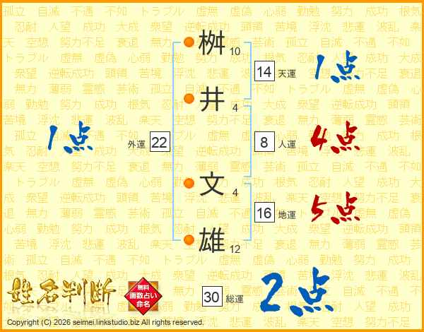 あなたの人生を表す1番重要な運勢です。生涯を通じて影響する総合運となり、主に50歳以降の晩年期に影響を及ぼします。苗字と名前の合計画数。