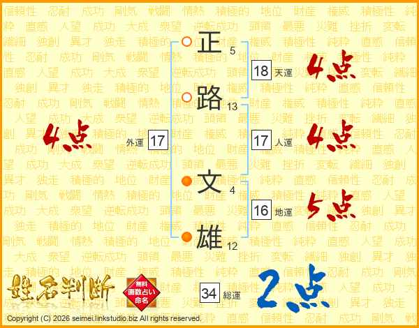 あなたの人生を表す1番重要な運勢です。生涯を通じて影響する総合運となり、主に50歳以降の晩年期に影響を及ぼします。苗字と名前の合計画数。