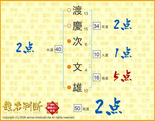 渡(13画)慶(15画)次(6画) 文(4画)雄(12画)