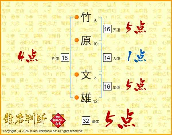 竹原文雄さんの総運は32画の5点!