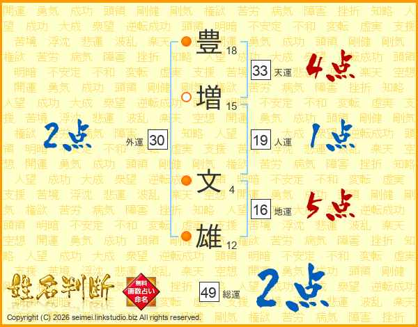 あなたの人生を表す1番重要な運勢です。生涯を通じて影響する総合運となり、主に50歳以降の晩年期に影響を及ぼします。苗字と名前の合計画数。