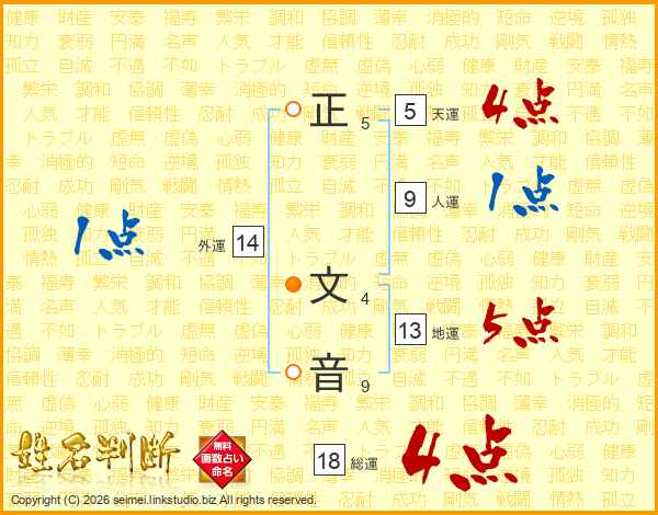 生活面を象徴する運勢です。外部から受ける影響力を表し、結婚運、家庭運や職場、環境への順応性を表します。総運から人運を引いた画数。姓や名が1文字の場合を除く。
