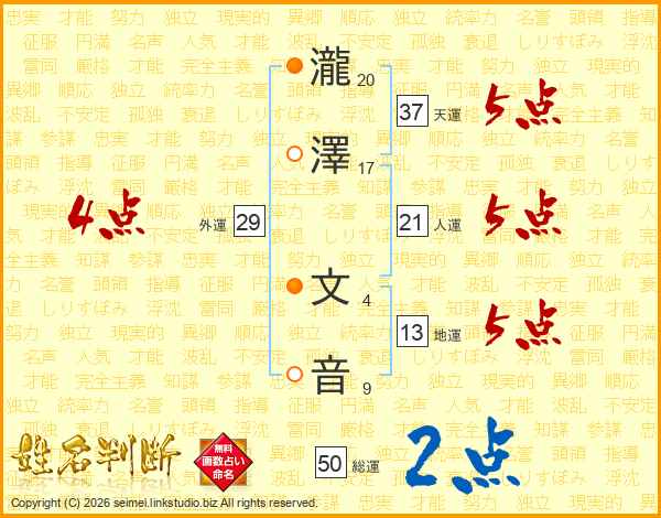 瀧(20画)澤(17画) 文(4画)音(9画)