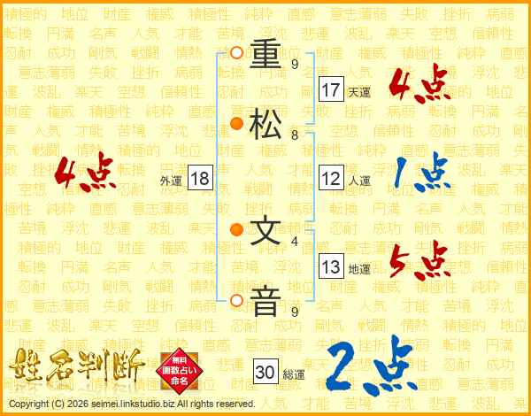 重(9画)松(8画) 文(4画)音(9画)