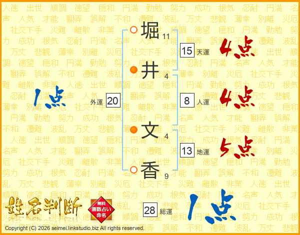 堀(11画)井(4画) 文(4画)香(9画)