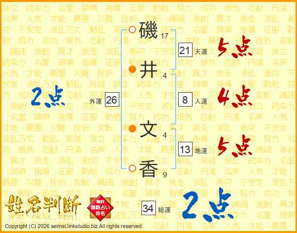 磯(17画)井(4画) 文(4画)香(9画)