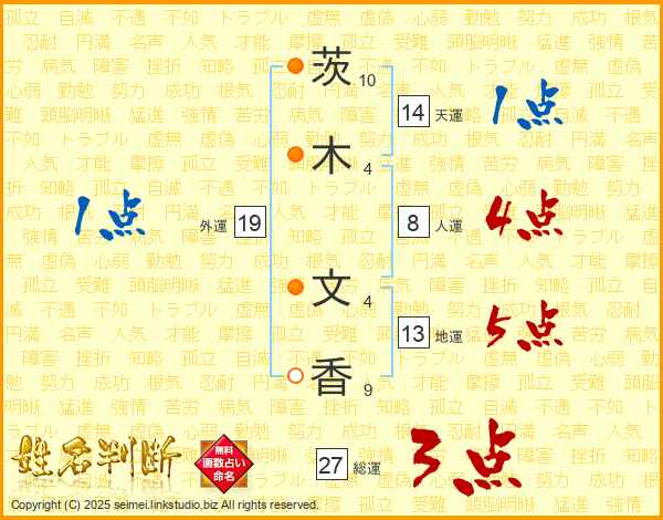 生活面を象徴する運勢です。外部から受ける影響力を表し、結婚運、家庭運や職場、環境への順応性を表します。総運から人運を引いた画数。姓や名が1文字の場合を除く。