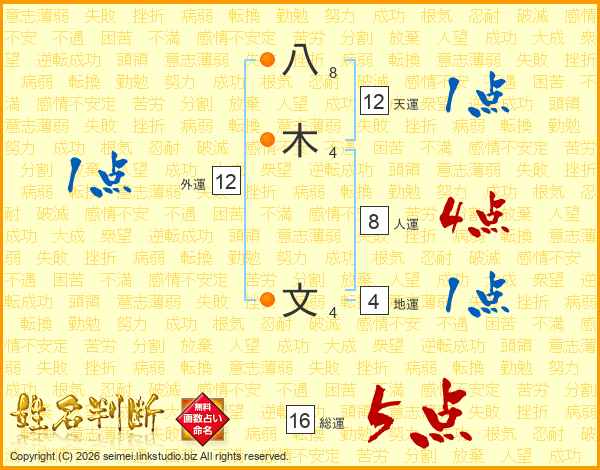 生活面を象徴する運勢です。外部から受ける影響力を表し、結婚運、家庭運や職場、環境への順応性を表します。総運から人運を引いた画数。姓や名が1文字の場合を除く。