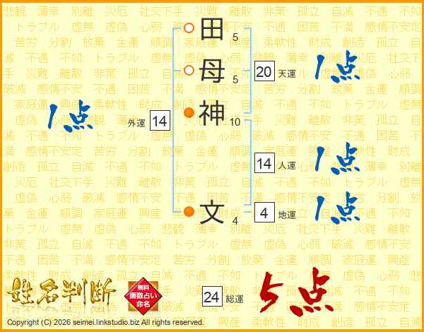 生活面を象徴する運勢です。外部から受ける影響力を表し、結婚運、家庭運や職場、環境への順応性を表します。総運から人運を引いた画数。姓や名が1文字の場合を除く。