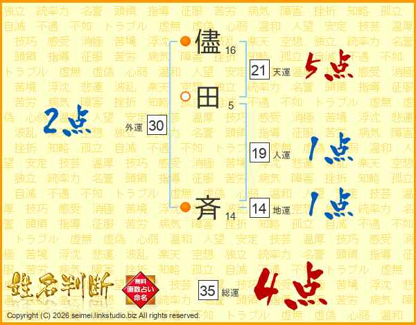 画数の奇数(○陽)と偶数(●陰)の配列で吉凶を占います。どちらかにかたよる名前は大凶名で避ける必要があります。画数の奇数偶数。