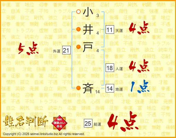 生活面を象徴する運勢です。外部から受ける影響力を表し、結婚運、家庭運や職場、環境への順応性を表します。総運から人運を引いた画数。姓や名が1文字の場合を除く。